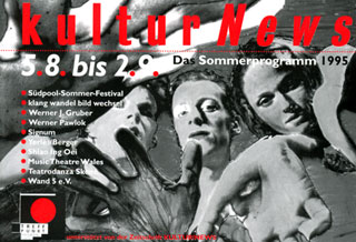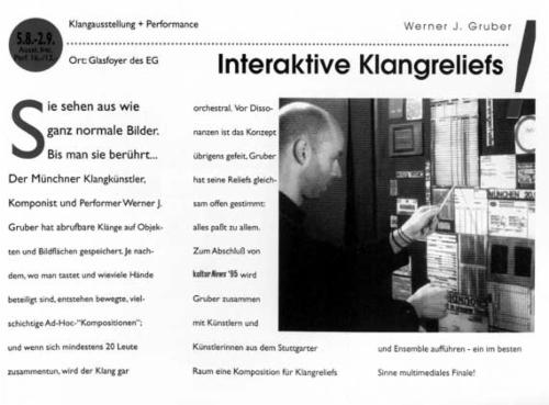 Zum Abschluß von kulturNews`95 wird Gruber zusammen mit dem Klangrelief Ensemble eine Kompositione für Klangreliefs aufführen - ein im besten Sinne multimediales Finale!"